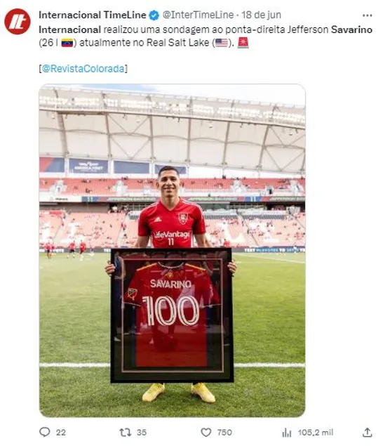 Trata-se do atacante Jefferson Savarino, que recentemente foi sondado pela direção do Internacional, que traçou planos para viabilizar a chegada do venezuelano ao Beira-Rio. Atualmente, o jogador, que estava no Atlético-MG, defende o Real Salt Lake, dos Estados Unidos. Todavia, segundo o portal Goal, em apuração que também reverberou na Revista Colorada, o São Paulo pode estar perto de deixar o Colorado comendo poeira no mercado da bola.