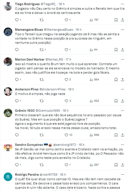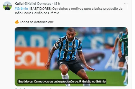 JP Galvão vem sendo utilizado como camisa 9, jogando na lacuna deixado pelo craque uruguaio Luis Suárez, que foi para o Inter Miami e também vem convivendo com problemas nos EUA. Ele vem sendo a referência do ataque do time gremista.