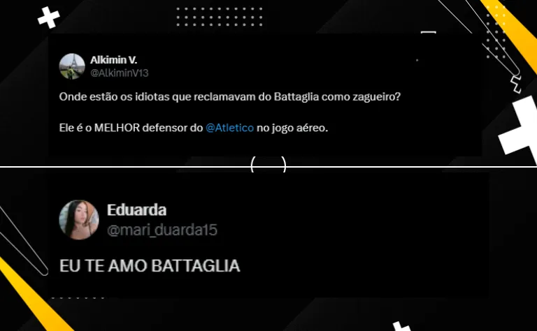 Porém, com o jogo, tornou-se uma das referências do Atlético-MG. “Nem é por causa do gol, mas o Battaglia hoje é o único com espírito com esse estilo de jogo”, elogiou um.
