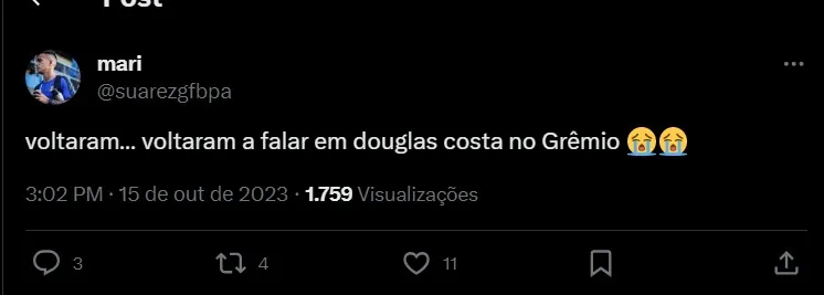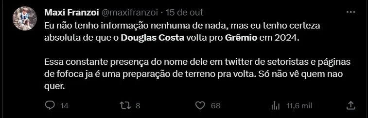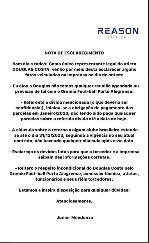 “Eu e o Douglas não temos qualquer reunião agendada ou previsão de tal com o Grêmio. Referente a dívida mencionada, iniciou-se a obrigação de pagamento das parcelas em Janeiro/2023, não tendo sido paga quaisquer parcela sobre a referido dívida até a data de hoje. A cláusula sobre o retorno a algum clube brasileiro estende-se até o dia 31/12/2023, seguindo a vigência do seu atual contrato, não havendo qualquer cláusula após essa data”.