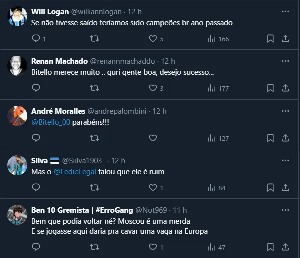 Até o momento, Bitello já realizou 27 partidas pelo clube, tendo marcado dez gols e contribuído com outras duas assistências. Dito isso, a expectativa é que o jogador receba propostas na próxima janela e renda uma boa grana aos cofres gremistas.