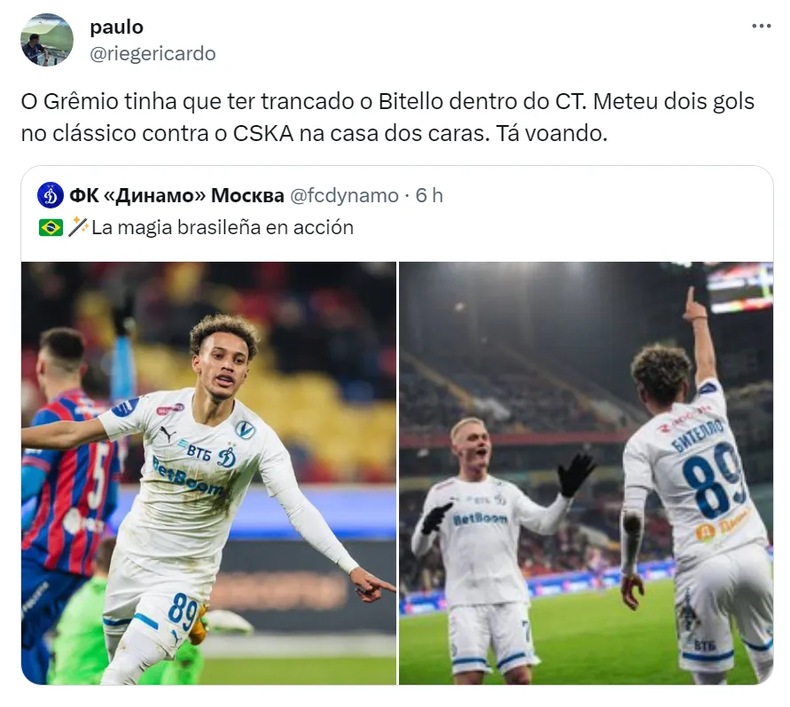 Desde que chegou ao Dinamo, o atleta soma três gols e uma assistência em nove jogos da ligal local, o que faz ele virar assunto na torcida do Grêmio. O time do meia é o terceiro colocado no Campeonato Russo.