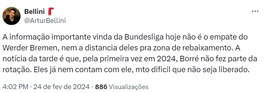 “Ele não entrou nenhum minuto. Claro que isso corrobora que Borré está se despedindo do Werder Bremen. Afinal, ele já está incomodado com o que vem acontecendo nos bastidores”, iniciou o repórter.