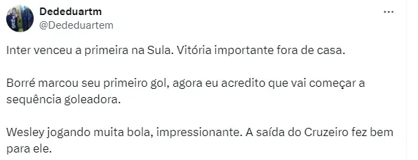 Um outro colorado ressaltou que ele ainda vai engrenar e ser um artilheiro no Inter. “Inter venceu a primeira na Sula. Vitória importante fora de casa. Borré marcou seu primeiro gol, agora eu acredito que vai começar a sequência goleadora”, escreveu em sua rede social.