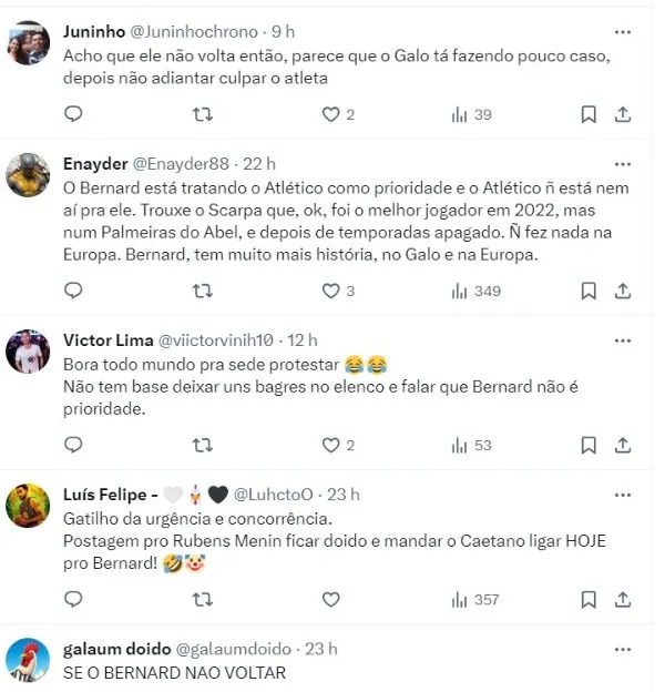 “Palmeiras, Vasco, Botafogo, Flamengo, São Paulo e mais 2 clubes europeus já fizeram consulta pelo Bernard, cujo contrato termina no meio do ano. Panathinaikos também quer a renovação. Ou o Galo trata a contratação como prioridade, ou continua pagando caro pra Vargas e Pedrinho”. escreveu Igor no X