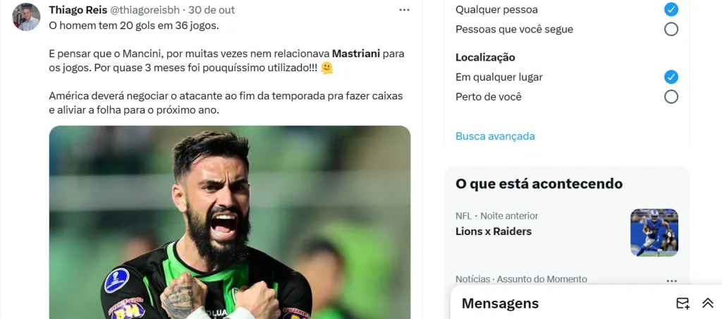Aos 30 anos, Mastriani tem contrato no América-MG até o fim de 2025, mas o provável rebaixamento para a Série B dificulta sua permanência. A Rádio Itatiaia diz que o Coelho se apoia em venda – a multa é de R$ 50 milhões.