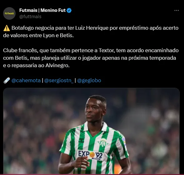 Um alvo do Botafogo na janela é o atacante Luiz Henrique, ex-Fluminense, que hoje atua no Real Bétis, da Espanha. De acordo com o GE, o Fogão avançou na chegada do jogador, após uma certa ‘manobra’ de John Textor.