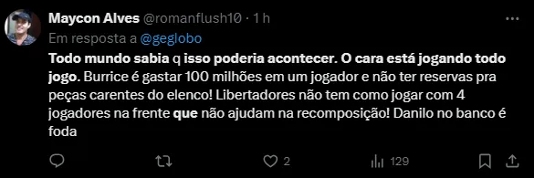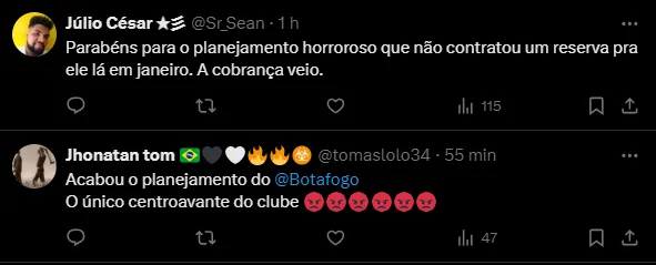 “Toda vez que vejo o Tiquinho Soares triste uma parte de mim morre”, “Todo mundo sabia que isso poderia acontecer. O cara está jogando todo jogo” e “Parabéns para o planejamento horroroso que não contratou um reserva pra ele lá em janeiro”, foram alguns comentários.