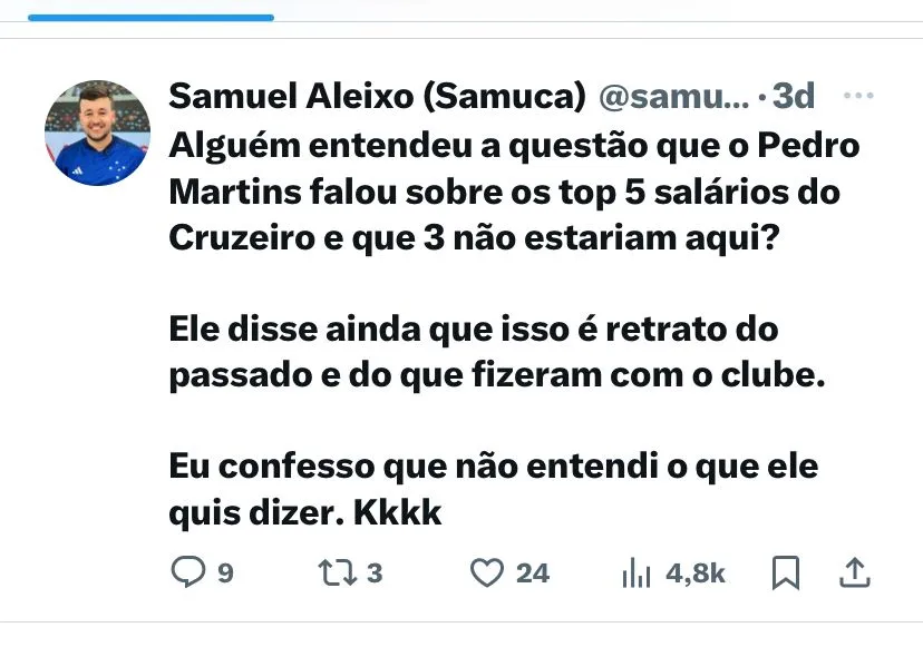 Pedro não deu detalhes ligados a nomes que excedem o padrão de salários da Raposa, porém, é bom lembrar que alguns dos jogadores contratados nas últimas janelas não tem integralidade dos vencimentos pelo Clube. Apesar dessa situação, a Raposa está ativa no mercado em busca de uma sombra para William.