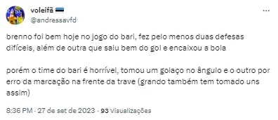 “Brenno foi bem hoje no jogo do Bari, fez pelo menos duas defesas difíceis, além de outra que saiu bem do gol e encaixou a bola, porém o time do Bari é horrível. Tomou um golaço no ângulo e o outro por erro da marcação na frente da trave”, comentou um torcedor gremista sobre uma das partidas recentes do arqueiro no futebol italiano.