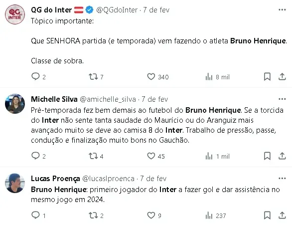 Os torcedores demonstraram sua satisfação com a atuação de Bruno Henrique, destacando sua importância para o time e elogiando sua contribuição para a vitória do Internacional.