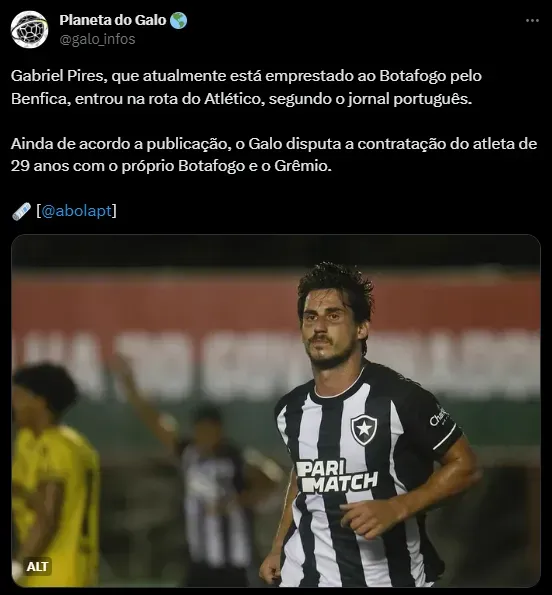 O Botafogo é um dos maiores alvos do ano, não só na tabela, mas também no mercado. Agora, o Fogão ganha intensa concorrência de clubes como Atlético Mineiro e Grêmio na corrida para agarrar o volante Gabriel Pires, atualmente emprestado pelo Benfica até o final de 2023. A notícia foi divulgada pelo jornalista turco Ekrem Konur e pelo jornal português “A Bola” nesta segunda-feira, (11).
