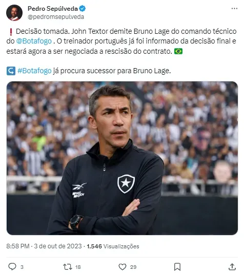 Na noite desta terça-feira (3), o Botafogo resolveu demitir o técnico Bruno Lage, segundo Globo Esporte. O português se despede do futebol brasileiro com 15 partidas a frente do Alvinegro, tendo vencido apenas em 4 oportunidades, empatado 7 e perdendo outros 4 jogos. No meio dessa notícia que já era pedida pelos adeptos do Glorioso, os rubro-negros passaram a pedir Sampaoli no Nilton Santos. Em tom provocativos, torcedores do Flamengo aconselharam Textor a contratar o antigo técnico do Rubro-Negro.