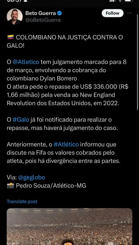 De acordo com a mesma fonte, o Galo tem um recurso a ser levado ao Tribunal Arbitral do Esporte (CAS) e trabalha para apresentá-lo nos próximos dias. Enquanto isso, a diretoria trabalha para negociar os valores.