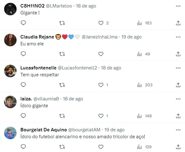 Diante desse momento especial que lateral e Fortaleza vivem, Tinga foi enfático: “Nem nos meus maiores sonhos eu imaginava chegar em um momento desses, tão grande e tão maravilhoso, para o Fortaleza e para mim. Mas a gente quer mais, com muita humildade e pé no chão. Temos que trabalhar forte para as coisas acontecerem lá em Maldonado (cidade uruguaia onde ocorrerá a final da Sula).”