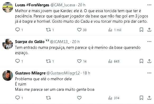 Cadu também foi questionado sobre a paciência dos torcedores com os jogadores mais jovens, que muitas vezes enfrentam críticas severas quando não conseguem se destacar imediatamente.