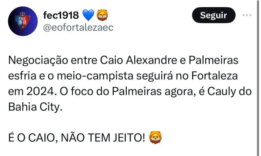“Quanto ao Caio Alexandre, existe um interesse do Palmeiras, real, existe uma conversa, mas não houve proposta formal. Não houve papel timbrado. Então trabalho com a sequência de compra do Caio, de o Caio ficar no Fortaleza” – afirmou Marcelo Paz, em entrevista ao Uol
