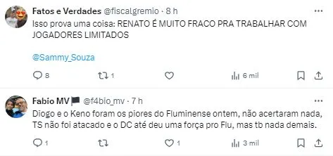 Caleffi ressaltou o profissionalismo de Diogo Barbosa e Thiago Santos, no entanto, sobrou para Douglas Costa: “O Diogo e o Thiago podem não ter entregado tecnicamente o esperado. Mas JAMAIS deixaram de ter profissionalismo e respeito com o Grêmio”, iniciou o ex-dirigente.