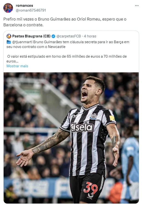 Há uma semana, o volante brasileiro Bruno Guimarães estendeu o seu vínculo com o Newcastle por mais cinco anos, até a temporada de 2028. Porém, a longa extensão do contrato não foi o que chamou a atenção do público. Segundo apuração do jornal espanhol Sport, o acordo entre clube e atleta teria uma “cláusula secreta”, que facilitaria a contratação do meio-campista por uma única equipe: o Barcelona.