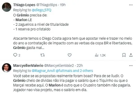 “Mesmo não sendo torcedor desse clube, um clube que eu respeito muito é o Grêmio, gosto muito, tem um treinador que eu gosto muito também e tem uma torcida incrível. Não é meu time do coração, mas é um time que eu admiro muito, que tem um perfil que o Marlon gosta bastante“, comentou.