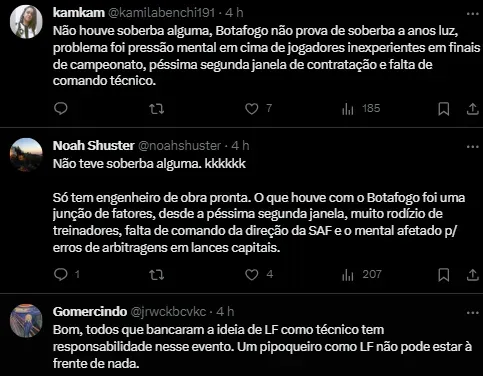 “‘Existem coisas que só acontecem com o Botafogo.’ Essa frase virou um jargão do time da Estrela Solitária, mas em 2023 ela passou dos limites. Depois do primeiro turno que fez, ganhando todas as partidas no seu estádio Nilton Santos, voltou para o segundo turno e fez uma campanha catastrófica jamais vista. Eu falei várias vezes que o Botafogo seria o campeão e que só perderia para ele mesmo, e foi o que se confirmou”, publicou Casagrande, em sua coluna no “UOL”.