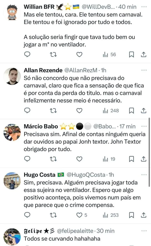 “É muita vezes irresponsável, sem prejuízo de ter que apurar, você fazer juízo de valor. Aquele jogador teve 80% de passes errados. Isso não significa que ele esteve envolvido. Há indícios? Então, tem que se apurar. Mas a responsabilidade tem que ser medida no que a gente fala”, concluiu.