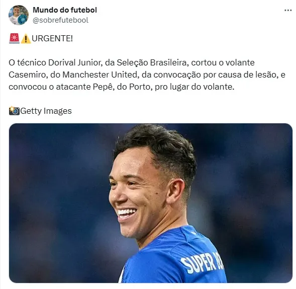 “Acabamos de receber um relatório do Dr. Rodrigo Lasmar. De uma pré-relação feita pela comissão técnica da Seleção Brasileira com 50 nomes, 13 deles já estavam afastados por lesão em seus clubes. Infelizmente, perdemos também Casemiro. Sendo assim, Pepê, do Porto, um atacante de origem e hoje atuando como meia, está convocado”, disse Dorival Jr.
