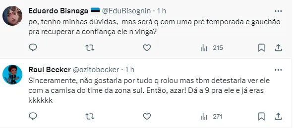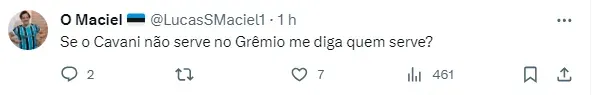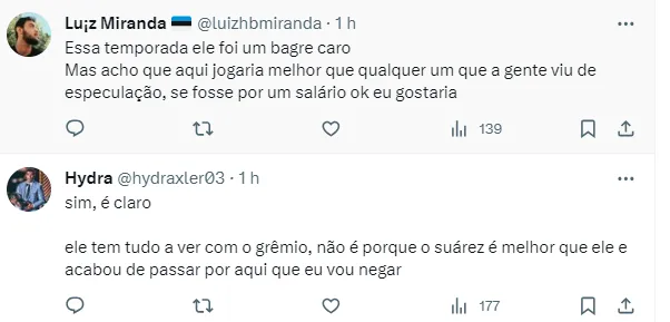 Em contrapartida, há aqueles que dizem que seu tempo passou: “Na boa, não. Está muito valorizado e tá jogando pouco”, disse um gremista. Outro seguiu a mesma linha: “Não. Mostrou ser ex-jogador”, completou.