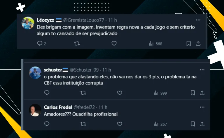 Com a divulgação do material, a frase que mais causou a ira dos gremistas partiu justamente do árbitro de vídeo, que sugeriu a revisão do lance já inclinando Alex Stefano a mudar a decisão: