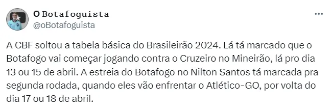 Nas cinco primeiras rodadas o Botafogo enfrenta, na sequência, o Cruzeiro (fora); o Atlético-GO (casa); o Juventude (casa); o Flamengo (fora) e o Bahia (casa). A estreia está prevista entre os dias 13 e 15 de abril. Confira a tabela completa ao final da matéria.