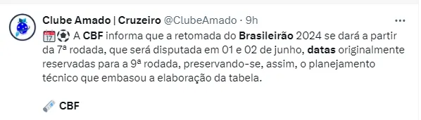 Somente no dia 16 de junho que voltaremos aos compromissos da nona rodada, que o Inter enfrentará o Vitória, na Bahia. Quanto aos jogos atrasados do Clube Gaúcho das rodadas 5 e 6 contra o Cruzeiro fora de casa e o Juventude como mandante, por enquanto, seguem sem datas definidas.