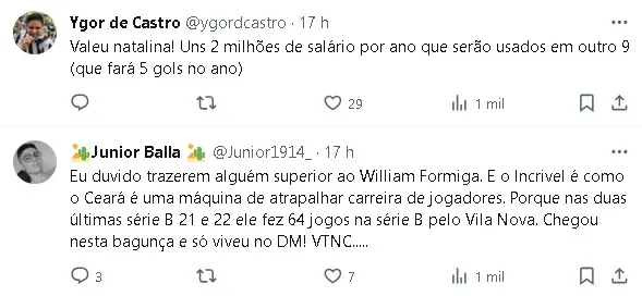 Além disso, o Ceará também anunciou o empréstimo do lateral William Formiga ao CRB até o final de 2024. William Formiga chegou ao Ceará em 2023, vindo do Vila Nova, e participou de 29 partidas, marcando um gol durante sua passagem pelo clube cearense.