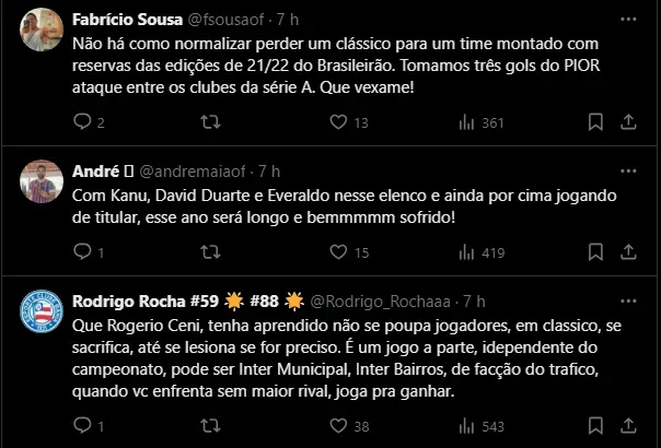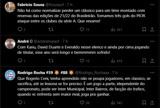 Em seguida, o rival do Tricolor Baiano vai ser o CRB, na quarta-feira (28), pela quarta rodada da Copa do Nordeste. O time de Rogério Ceni está disputando três competições neste começo de temporada.