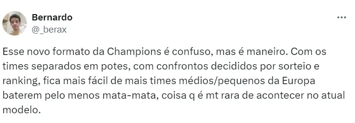 “Isto dá aos clubes a oportunidade de se testarem contra um leque mais vasto de adversários e aumenta a probabilidade de os torcedores verem as equipes de topo se enfrentarem com mais frequência e mais cedo na competição”, afirmou a Uefa por meio de um comunicado.