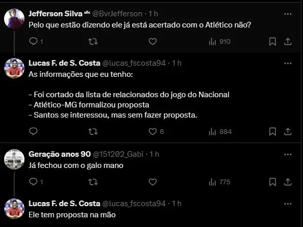 Apesar da procura santista, o Atlético-MG segue, pelo menos por enquanto, na dianteira da corrida para a contratação do colombiano. Inclusive, o ponta ficou fora da partida do Atlético Nacional.