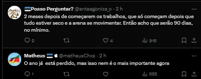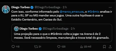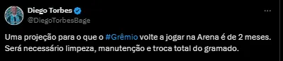“Uma projeção para o que o Grêmio volte a jogar na Arena é de 2 meses. Será necessária limpeza, manutenção e troca total do gramado”, informou o colega.
