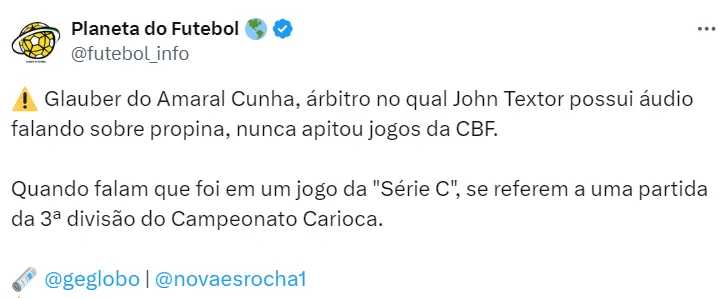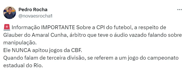 Conforme as informações do jornalista, Glauber do Amaral Cunha apitou jogos da Série C do Campeonato Carioca, o que corresponde a jogos da terceira divisão do estadual.