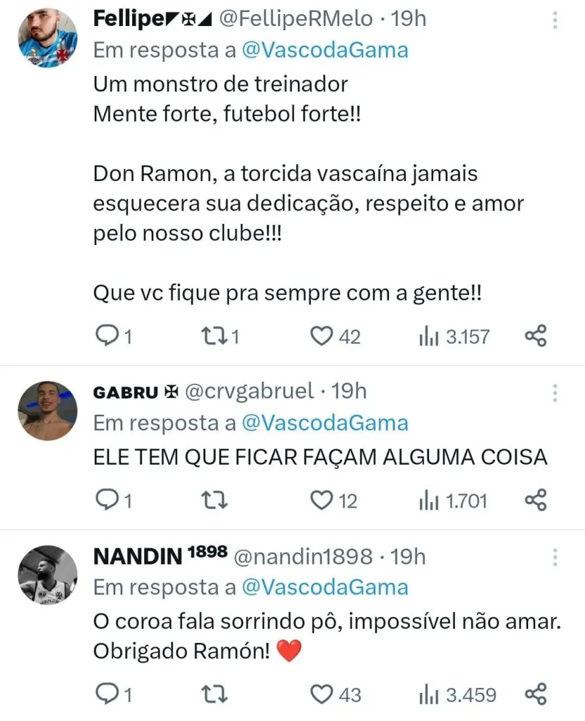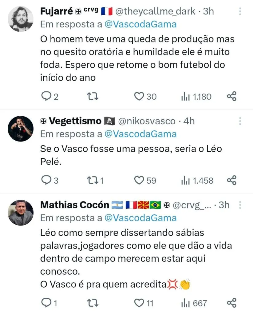 “Há coisas que, se a mente se propõe a fazer, conseguimos fazer. Se nós queremos e dizemos que o Vasco vai se salvar é porque vai se salvar. Temos que pensar sempre positivo. Os desafios são lindos, e assim é lindo ganhar. E isso não é só no futebol. É na vida. Não há nada que se possa conseguir com a força mental. Obrigado”, disse.