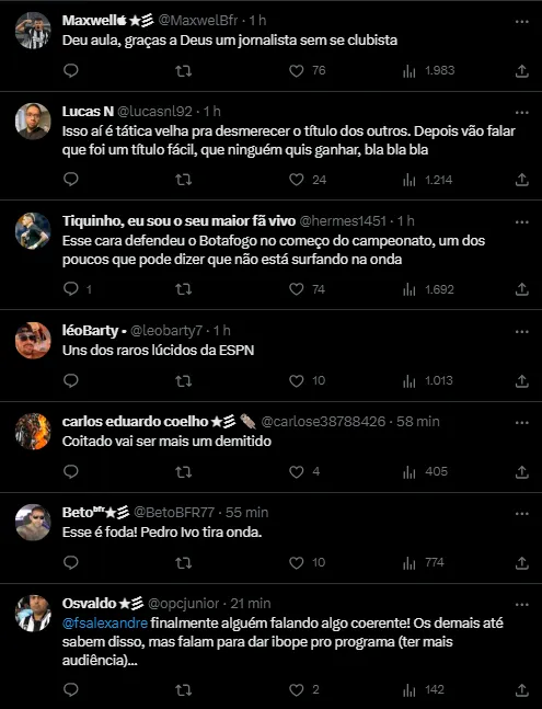 “Que força que a turma faz para colocar o Flamengo na briga, hein! O próprio Flamengo não se colocou na briga, mas a turma quer colocar o Flamengo na briga? Por que o debate é essa força para colocar o Flamengo na briga e não como o Botafogo está na briga e os outros não estão? O debate é o que falta para o Botafogo ser campeão, e não para saber quem vai ser o vice! Se o Botafogo perder cinco jogos seguidos e o Flamengo ganha cinco jogos seguidos, a gente vem aqui e fala!”, disse Pedro.