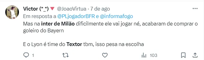 Com o objetivo de levá-lo para a França, o investidor norte-americano tem mantido a postura de cobrir toda proposta que chegue ao goleiro, o que seria vantajoso para Textor, se o goleiro for para o Lyon, pois estaria ‘em casa’.