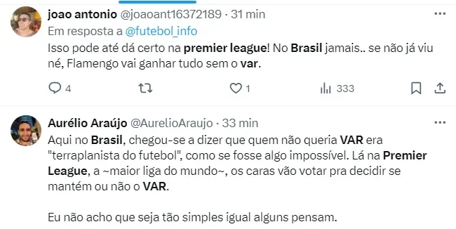 Por aqui, nenhuma atitude enérgica quanto a tirar o VAR foi pedida. Mas depois que a Premier League, o maior campeonato nacional de clubes do mundo, está pedindo a exclusão do equipamento, é bom ficarmos ligado sobre como isso repercutirá em nosso território.