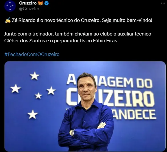 O Cruzeiro anunciou nesta terça-feira (5) a contratação do técnico Zé Ricardo. O comandante chegará a Toca Raposa com a missão de evitar que o Time Mineiro entre no grupo das equipes que lutam contra o rebaixamento e também para melhorar estatísticas.