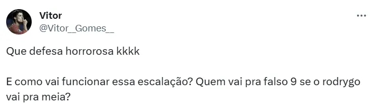 Duas opções foram testadas por Fernando Diniz. A primeira: Alisson; Emerson Royal, Marquinhos, Gabriel Magalhães e Renan Lodi; André e Bruno Guimarães; Raphinha, Rodrygo, Gabriel Martinelli; Vinícius Júnior.