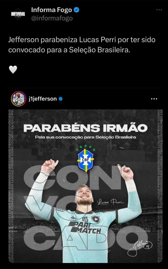 “E essa convocação, nada mais justo. Era só questão de tempo para ele ser convocado. Fico muito feliz pela convocação dele, pelo momento e pela visibilidade que o Botafogo está passando. É bom para ele, mas também para o clube por voltar a ter alguém convocado”, finalizou.