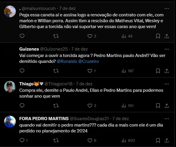 Entretanto, segundo o portal Pioneiro, Thiago Carpini deve permanecer no Juventude para a temporada de 2024. O Cruzeiro continuará no mercado de olho nas opções disponíveis.