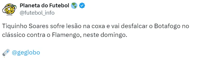 No confronto contra o Universitario, Tiquinho Soares foi substituído aos 10 minutos do primeiro tempo. Até o momento, sabe-se que é uma lesão no músculo posterior da coxa.