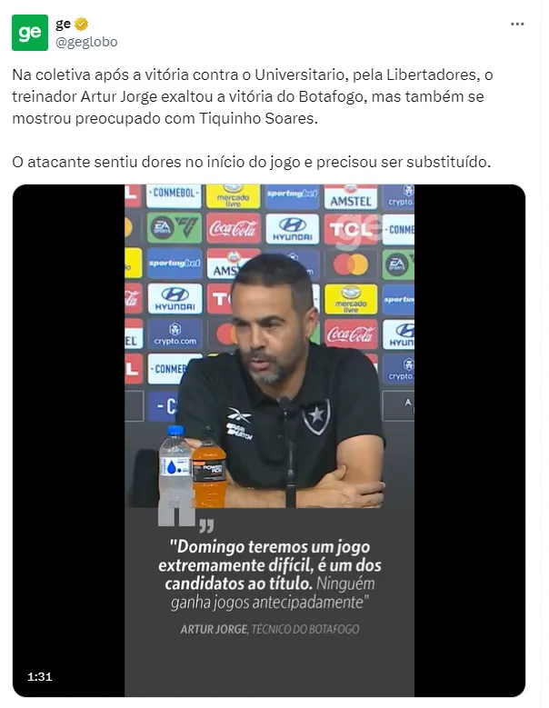 O técnico Artur Jorge, que promoveu algumas mudanças para o jogo, como a troca de Gatito por John no gol, terá uma dor de cabeça para encontrar substitutos no setor ofensivo.