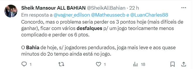 O Esquadrão está com 34 pontos no Brasileiro e na 15ª colocação, três acima do Goiás, que abre a zona do rebaixamento com 31 pontos. Já o Fluminense, próximo adversário do Bahia, ocupa o oitavo lugar ta tabela da Série A, com 45 pontos, quatro abaixo do G-6.