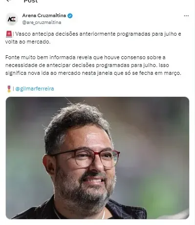 Segundo informado pela Arena Cruzmaltina no X (antigo Twitter), o Vasco iria ao mercado somente em julho para algumas posições, mas que essa decisão foi mudada no Clube.