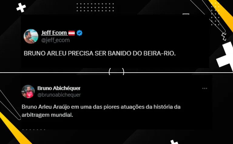 No X (antigo Twitter), os torcedores não perdoaram as atitudes do árbitro em relação ao Internacional. “Bruno Arleu não pode mais apitar jogo do Inter nem por decreto“, apontou um internauta.